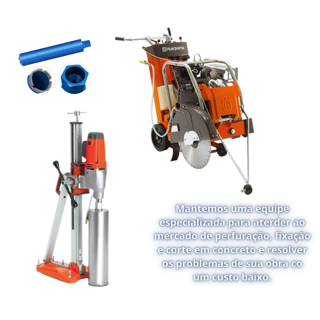 Locação de equipamentosVenha alugar seu equipameto e facilite sua vida! ServiçosMantemos uma equipe especializada para aterder ao mercado de perfuração, fixação e corte em concreto e resolver os problemas de sua obra co um custo baixo. Faça o seu orçamento Locação de equipamentos Serviços EPI Consumíveis Faça o seu orçamento